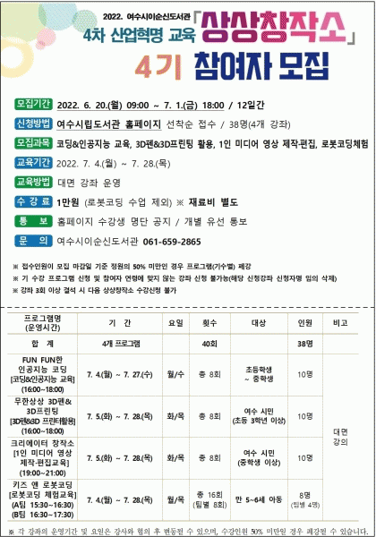 [¹Ìµð¾îÀü³² ÀüÇü¼º ±âÀÚ] ¿©¼ö½Ã À̼ø½Åµµ¼°üÀÌ 4Â÷ »ê¾÷±³À° ¡®»ó»óâÀÛ¼Ò 4±â¡¯ Âü¿©ÀÚ¸¦ ¸ðÁýÇÑ´Ù. ±³À° ±â°£Àº 7¿ù 4ÀϺÎÅÍ 28ÀϱîÁö¸ç ´ë¸é °Á·ΠÁøÇàµÈ´Ù. ÄÚµù£¦ÀΰøÁö´É ±³À° 3DÆæ£¦3DÇÁ¸°ÅÍ È°¿ë±³À° 1ÀÎ ¹Ìµð¾î ¿µ»ó Á¦¡¦