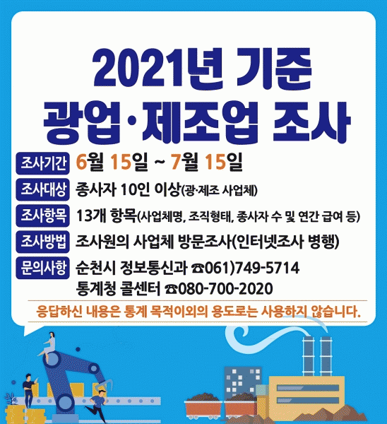 [¹Ìµð¾îÀü³² ÀÓ¼º¿Ï ±âÀÚ] ¼øÃµ½Ã´Â ¿À´Â 6¿ù 15ÀϺÎÅÍ 7¿ù 15ÀϱîÁö ¡®2021³â ±âÁØ ±¤¾÷¡¤Á¦Á¶¾÷Á¶»ç¡¯¸¦ ½Ç½ÃÇÑ´Ù. Åë°èûÀÌ ÁÖ°üÇØ ¸Å³â ½Ç½ÃÇÏ´Â ±¤¾÷¡¤Á¦Á¶¾÷ Á¶»ç´Â ¼øÃµ½Ã »ç¾÷üÀÇ ±¸Á¶¿Í ºÐÆ÷ °æ¿µ½ÇŸ¦ ÆÄ¾ÇÇØ, ¼øÃµ½Ã¿Í ±¹°¡¡¦