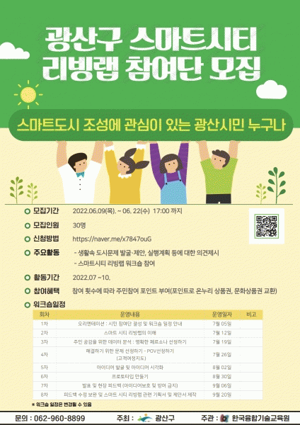 [¹Ìµð¾îÀü³² ±èÁ¤¿ì ±âÀÚ] ±¤ÁÖ ±¤»ê±¸´Â ¿À´Â 22ÀϱîÁö ¡®½º¸¶Æ®½ÃƼ ¸®ºù·¦¡¯¿¡ Âü¿©ÇÒ ½Ã¹ÎÂü¿©´ÜÀ» ¸ðÁýÇÑ´Ù°í ¹àÇû´Ù. ½º¸¶Æ®½ÃƼ ¸®ºù·¦Àº ½Ã¹Î°ú ÇÔ²² IOT, ICT, AI µî 4Â÷ »ê¾÷±â¼úÀ» Ȱ¿ëÇØ ±³ÅëºÒÆí, ȯ°æ¿À¿° µî °¢Á¾ µµ½Ã¹®¡¦