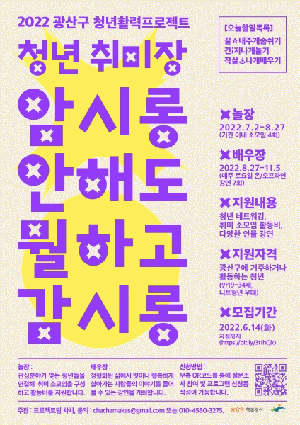 [¹Ìµð¾îÀü³² ±èÁ¤¿ì ±âÀÚ] ±¤ÁÖ ±¤»ê±¸°¡ 2022 û³âȰ·ÂÇÁ·ÎÁ§Æ® ¸®ºù·¦ ¡®Ã»³â Ãë¹ÌÀå, ¾Ï½Ã·Õ ¾ÈÇØµµ ¹»ÇÏ°í °¨½Ã·Õ¡¯ÀÇ Âü¿©ÀÚ¸¦ ¸ðÁýÇÑ´Ù. ¡®´ÏÆ®Á·¡¯À» »çȸ·Î À̲ø¾î³» Ȱ·ÂÀ» ºÒ¾î³Ö±â À§ÇÑ »ç¾÷À¸·Î Áö³ 2¿ù ŸÁö¿¡¼ ±¤»ê±¸ ¼Û¡¦