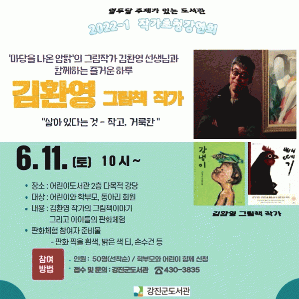 [¹Ìµð¾îÀü³² Á¦°¥´ëÁ¾ ±âÀÚ] °Áø±ºµµ¼°üÀº ¿À´Â 6¿ù 11ÀÏ ¿ÀÀü 10½Ã °Áø±º µµ¼°ü ´Ù¸ñÀû °´ç¿¡¼ ¡®¸¶´çÀ» ³ª¿Â ¾Ïż¡¯, ¡®°³ÃÀÌ¡¯, ¡®»©¶¼±â¡¯ÀÇ ±×¸²Ã¥ ÀÛ°¡·Î ³Î¸® ¾Ë·ÁÁø ±èȯ¿µ ÀÛ°¡ ÃÊû°¿¬È¸¸¦ °³ÃÖÇÑ´Ù. À̹ø ÀÛ°¡ÃÊû°¡¦