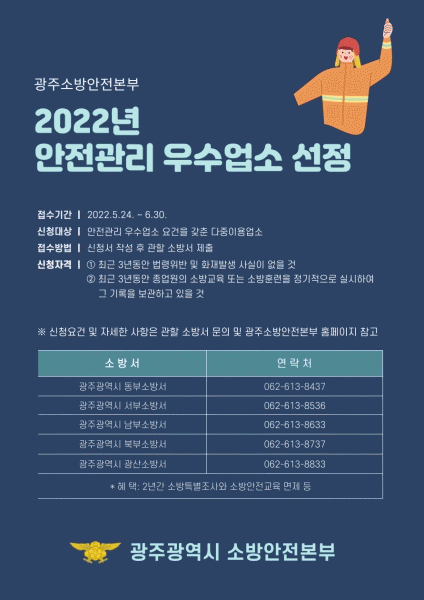 [¹Ìµð¾îÀü³² Á¦°¥´ëÁ¾ ±âÀÚ] ±¤ÁÖ±¤¿ª½Ã ¼Ò¹æ¾ÈÀüº»ºÎ´Â 6¿ù30ÀϱîÁö ÀÚÀ²¾ÈÀü°ü¸® ¹®È Á¤ÂøÀ» À§ÇÑ 2022³â ¾ÈÀü°ü¸® ¿ì¼ö ´ÙÁßÀÌ¿ë¾÷¼Ò¸¦ ¸ðÁýÇÑ´Ù. ½Åû ´ë»óÀº ±¤Áֽà ³» ´ÙÁßÀÌ¿ë¾÷¼Ò Áß ¿ì¼ö¾÷¼Ò ¿ä°ÇÀ» °®Ãá ¿µ¾÷ÀåÀ¸·Î °üÇÒ ¼Ò¹æ¡¦