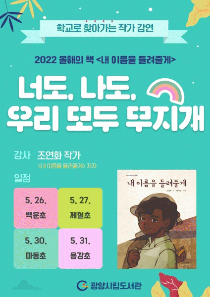 [¹Ìµð¾îÀü³² ÀÓ¼º¿Ï ±âÀÚ] ±¤¾ç½Ã¸³µµ¼°üÀÌ ¿À´Â 5¿ù 26~31ÀÏ Áö¿ª ³» ÃʵîÇлýÀ» ´ë»óÀ¸·Î ¡®2022 ¿ÃÇØÀÇ Ã¥¡¯À¸·Î ¼±Á¤µÈ ¾î¸°ÀÌ µµ¼ ¡®³» À̸§À» µé·ÁÁÙ°Ô¡¯ÀÇ ÀúÀÚ Á¶¿¬È ÀÛ°¡¸¦ ÃÊÃ»ÇØ Çб³·Î ã¾Æ°¡´Â °¿¬À» ¿¬´Ù. ¿ÃÇØÀÇ Ã¥ ¡¦