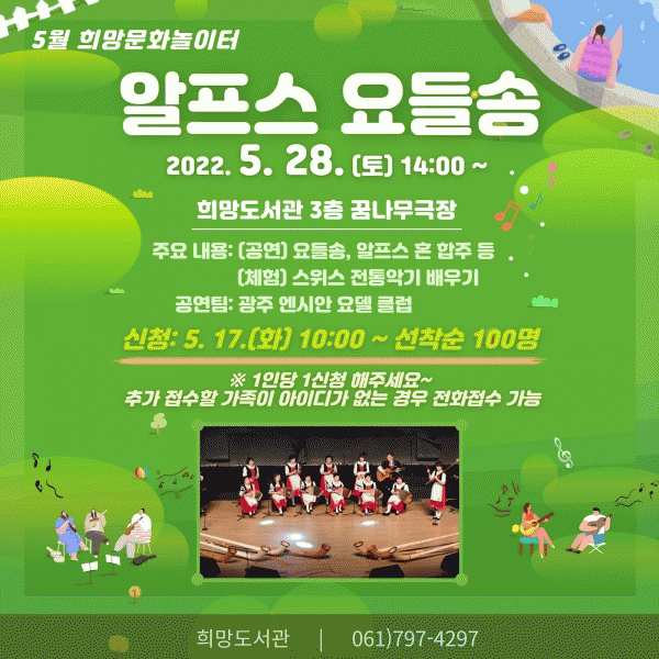 [¹Ìµð¾îÀü³² ÀÓ¼º¿Ï ±âÀÚ] ±¤¾çÈñ¸Áµµ¼°üÀº ¹®È°¡ ÀÖ´Â ³¯ÀÎ 5¿ù 28ÀÏ ¿ÀÈÄ 2½Ã ¡®Èñ¸Á¹®È³îÀÌÅÍ¡¯ Çà»ç·Î ¾î¸°ÀÌ °¡Á· 100¸íÀ» ´ë»óÀ¸·Î ¡®¾ËÇÁ½º ¿äµé¼Û¡¯ °¡Á· À½¾Çȸ¸¦ ¿î¿µÇÑ´Ù. µµ¼°ü 3Ãþ ²Þ³ª¹«±ØÀå¿¡¼ ¿¸®´Â À̹ø À½¾Çȸ¡¦