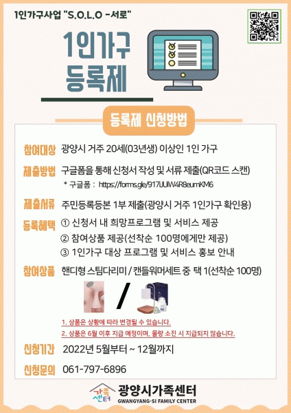 [¹Ìµð¾îÀü³² ÀÓ¼º¿Ï ±âÀÚ] ±¤¾ç½Ã °¡Á·¼¾ÅÍ´Â ¿ÃÇØ ½Ã¹ü»ç¾÷À¸·Î 5¿ùºÎÅÍ ¡®1ÀÎ °¡±¸ »çȸÀû °ü°è¸Á Çü¼º Áö¿ø»ç¾÷: S.O.L.O¡¯¸¦ ÃßÁøÇϰí ÀÖ´Ù. 1ÀÎ °¡±¸¶õ Çо÷, Á÷Àå µîÀ¸·Î ÀÎÇØ °¡Á·°ú ¶³¾îÁ® È¥ÀÚ »ç´Â °¡Á·À» ¸»ÇÏ¸ç ¼¾ÅÍ´Â ±¤¾ç¡¦