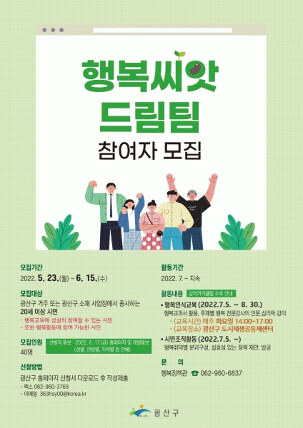 [¹Ìµð¾îÀü³² ±èÁ¤¿ì ±âÀÚ] ±¤ÁÖ ±¤»ê±¸°¡ 23ÀϺÎÅÍ 2022 Çູ¾¾¾Ñµå¸²ÆÀ 1±â Âü¿©ÀÚ¸¦ ¸ðÁýÇÑ´Ù. Çູ¾¾¾Ñµå¸²ÆÀÀº Çູ ÀÌ·ÐÀ» ¹è¿ì°í ½ÇõÇϸç Áö¿ª ³» Çູ¹®È¸¦ ÀüÆÄÇÏ´Â ½Ã¹ÎÁ¶Á÷ÀÌ´Ù. ±¤»ê±¸ °ÅÁÖ ¶Ç´Â ±¤»ê±¸ ¼ÒÀç »ç¾÷Àå¿¡ Á¾¡¦