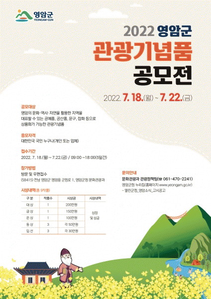 [¹Ìµð¾îÀü³² ±è±âö ±âÀÚ] Àü¶ó³²µµ ¿µ¾Ï±ºÀº Áö¿ªÀÇ Æ¯»öÀÖ°í ½Ç¿ëÀûÀÎ ¿ì¼ö °ü±¤±â³äǰÀ» ¹ß±¼Çϱâ À§ÇØ ¡°2022 ¿µ¾Ï±º °ü±¤±â³äǰ °ø¸ðÀü¡±À» °³ÃÖÇÑ´Ù. À̹ø °ø¸ðÀüÀÇ Á¢¼ö ±â°£Àº 7¿ù 18ÀϺÎÅÍ 22ÀϱîÁö 5Àϰ£À¸·Î ´ëÇѹα¹ ±¹¹Î ´©¡¦