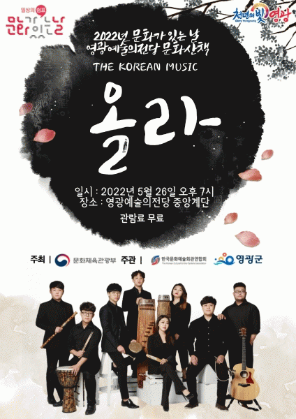 [¹Ìµð¾îÀü³² Á¦°¥´ëÁ¾ ±âÀÚ] ¿µ±¤±ºÀº ¿À´Â 26ÀÏ ¿ÀÈÄ 7½Ã¿¡ ¿µ±¤¿¹¼úÀÇÀü´ç ¾ß¿Ü°ø¿¬Àå¿¡¼ ¡®2022³â ¹®È°¡ ÀÖ´Â ³¯¡¯ ¹®È»êÃ¥ ÇÁ·Î±×·¥À¸·Î¡®THE KOREAN MUSIC ¿Ã¶ó¡¯°ø¿¬ÀÌ ÆîÃÄÁø´Ù°í ¹àÇû´Ù. À̹ø °ø¿¬Àº ¹æ¼öÁö, Á¤¼®ÁÖ, ÀÌȸ²¡¦