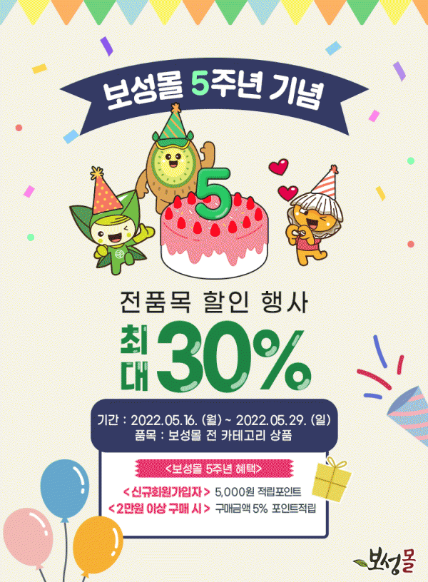 [¹Ìµð¾îÀü³² Á¦°¥´ëÁ¾ ±âÀÚ] º¸¼º±ºÀº 5¿ù 16ÀϺÎÅÍ 5¿ù 29ÀϱîÁö ¿Â¶óÀÎ ³óƯ»ê¹°¼îÇθô ¡®º¸¼º¸ô ¡¯¿ÀÇ 5Áֳ⠸ÂÀÌ Æ¯º°ÇÒÀÎ Çà»ç¸¦ ÁøÇàÇÑ´Ù. Ưº°ÇÒÀÎ Çà»ç´Â ³óƯ»ê¹° ÃÖ´ë 30% ÇÒÀÎÀ» ºñ·ÔÇØ, ½Å±Ôȸ¿ø 5,000¿ø Àû¸³±Ý Áö±Þ, ±¸¡¦