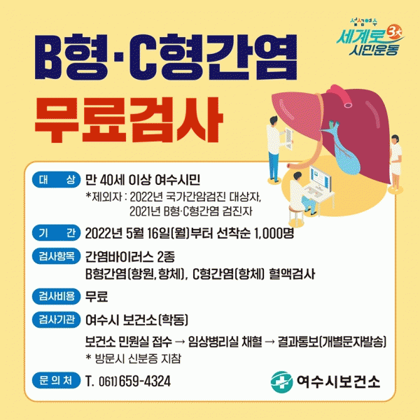 [¹Ìµð¾îÀü³² ÀüÇü¼º ±âÀÚ] ¿©¼ö½Ã°¡ ¿À´Â 16ÀϺÎÅÍ ¸¸ 40¼¼ ÀÌ»ó ½Ã¹Î 1,000¸íÀ» ´ë»óÀ¸·Î BÇü, CÇü°£¿° ¹«·á°Ë»ç¸¦ ½Ç½ÃÇÑ´Ù. °Ë»ç¸¦ ¿øÇÏ´Â ½Ã¹ÎÀº ½ÅºÐÁõÀ» ÁöÂüÇÏ°í ¿©¼ö½Ã º¸°Ç¼Ò·Î ¹æ¹®ÇÏ¸é µÈ´Ù. ´Ü, °£¾Ï¹ß»ý °íÀ§Ç豺ÀÎ ¿ÃÇØ ¡¦