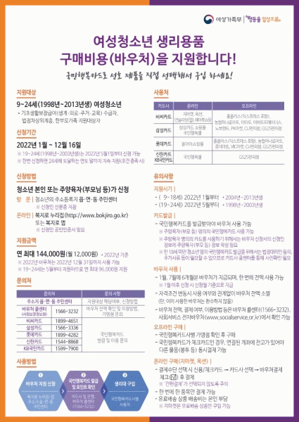 [¹Ìµð¾îÀü³² Á¦°¥´ëÁ¾ ±âÀÚ] ¿µ±¤±ºÀº ¸¸ 11¼¼¡18¼¼ Àú¼ÒµæÃþ ¿©¼ºÃ»¼Ò³â¿¡°Ô Áö¿øÇÏ´ø »ý¸®¿ëǰ ±¸ÀÔ ¹Ù¿ìó¸¦ ¸¸ 9¼¼~24¼¼ ±îÁö È®´ë Áö¿ø ÇÑ´Ù°í ¹àÇû´Ù. Áö¿ø ´ë»óÀº ±âÃÊ»ýȰ¼ö±Þ, ¹ýÁ¤Â÷»óÀ§, ÇѺθð°¡Á·Áö¿ø ´ë»óÀ¸·Î ½ÅûÀº ÁÖ¡¦