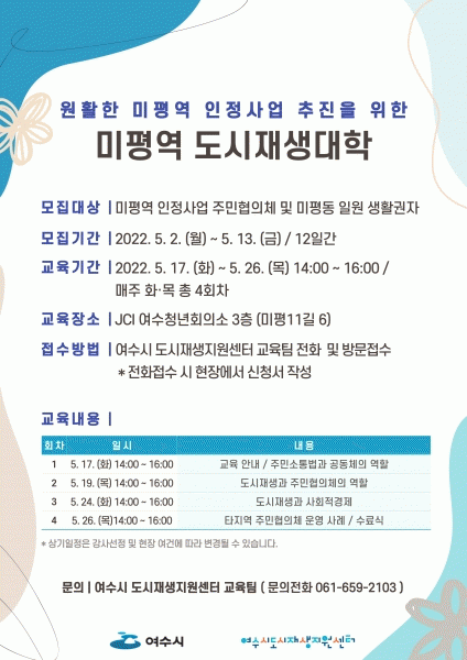 [¹Ìµð¾îÀü³² ÀüÇü¼º ±âÀÚ] ¿©¼ö½Ã°¡ ±¸ ¹ÌÆò¿ª»ç ÀÏ¿øÀÇ µµ½ÃÀç»ý ÀÎÁ¤»ç¾÷À» ÁغñÇϱâ À§ÇØ Áö¿ª Áֹΰú ÇùÀÇü¸¦ ´ë»óÀ¸·Î ¡®¹ÌÆò¿ª µµ½ÃÀç»ý´ëÇС¯À» ¿î¿µÇÑ´Ù. ±³À°Àº 5¿ù 17ÀϺÎÅÍ 26ÀϱîÁö ¸ÅÁÖ È¿äÀϰú ¸ñ¿äÀÏ ÃÑ 4ȸ¿¡ °ÉÃÄ Áø¡¦