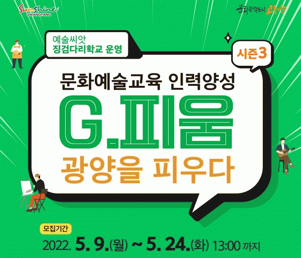 [¹Ìµð¾îÀü³² ÀÓ¼º¿Ï ±âÀÚ] ±¤¾ç½Ã°¡ ¿À´Â 6¿ùºÎÅÍ ¹®È¿¹¼ú±³À° Àη¾缺À» À§ÇÑ G.ÇÇ¿ò ½ÃÁð3À» ¿î¿µÇÑ´Ù. ¼ö°»ý ¸ðÁý ±â°£Àº 5¿ù 9ÀÏ~24ÀÏ ¿ÀÈÄ 1½ÃÀÌ¸ç ¸ðÁýÀοøÀº 5°³ ºÐ¾ß 4¸í¾¿ ÃÖ´ë 20¸íÀÌ´Ù. Âü¿©´ë»óÀº ¹®È¿¹¼ú±³À°À» Áغñ¡¦