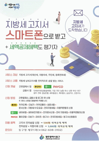 [¹Ìµð¾îÀü³² ±èÁ¤¿ì ±âÀÚ] ±¤ÁÖ µ¿±¸´Â ÁֹεéÀÇ Áö¹æ¼¼ ³³ºÎ ÆíÀǸ¦ ³ôÀÌ°í ¼¼¾×°øÁ¦ ÇýÅÃÀ» ´Ã¸®´Â ¡®°íÁö¼ ÀüÀÚ¼Û´Þ ¼ºñ½º¡¯¸¦ 5¿ùºÎÅÍ È®´ë ½ÃÇàÇÑ´Ù°í ¹àÇû´Ù. À̹ø ¼ºñ½º´Â Áö¹æ¼¼ °íÁö¼¸¦ Á¾ÀÌ ÅëÁö¼°¡ ¾Æ´Ñ ÀüÀÚ¿ìÆí, ±ÝÀ¶¡¦
