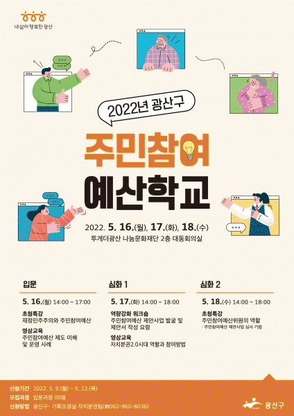 [¹Ìµð¾îÀü³² ±èÁ¤¿ì ±âÀÚ] ±¤ÁÖ ±¤»ê±¸´Â ÁÖ¹ÎÀÇ ¿¹»ê ¿î¿µ ¹× Æí¼º¿¡ ´ëÇÑ Âü¿©¿Í ÀÌÇØ¸¦ µ½±â À§ÇØ ¡®2022 ±¤»ê±¸ ÁÖ¹ÎÂü¿©¿¹»êÇб³¡¯¸¦ ¿î¿µÇÑ´Ù°í ¹àÇû´Ù. 16ÀϺÎÅÍ 18ÀϱîÁö Åõ°Ô´õ±¤»ê ³ª´®¹®ÈÀç´Ü 2Ãþ ´ëµ¿È¸Àǽǿ¡¼ ¿¸®´Â ¡®¡¦