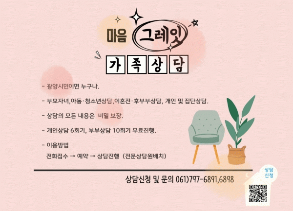 [¹Ìµð¾îÀü³² ÀÓ¼º¿Ï ±âÀÚ] ±¤¾ç½Ã °¡Á·¼¾ÅÍ´Â ±¤¾ç½Ã¹ÎÀ» ´ë»óÀ¸·Î °¡Á· ³» ´Ù¾çÇÑ °¥µîÀ» ÇØ°áÇÒ ¼ö ÀÖ´Â °³ÀΡ¤Áý´Ü»ó´ã ÇÁ·Î±×·¥ ¡®¸¶À½ ½°ÅÍ¡¯¸¦ °¡Á· »ó´ã»ç¾÷À¸·Î Á¦°øÇϰí ÀÖ´Ù. Áö³ÇØ¿¡´Â ±¤¾ç½Ã¹Î 1,600¿©¸íÀÌ Àü¹®»ó´ã°¡·ÎºÎ¡¦