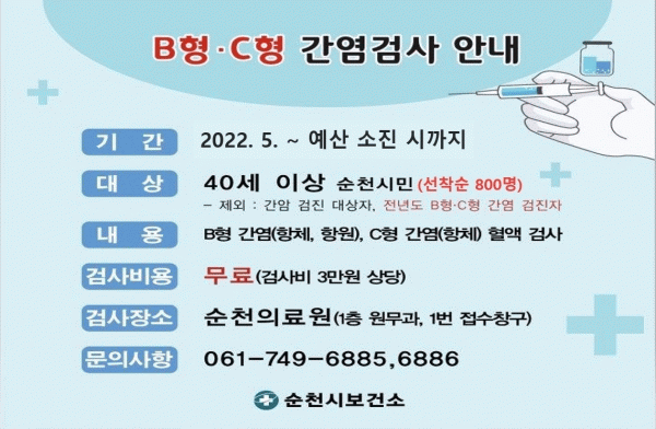 [¹Ìµð¾îÀü³² ÀÓ¼º¿Ï ±âÀÚ] ¼øÃµ½Ã´Â ¿À´Â 5¿ùºÎÅÍ ¸¸40¼¼ ÀÌ»ó ¼øÃµ½Ã¹ÎÀ» ´ë»óÀ¸·Î BÇüCÇü°£¿° ¹«·á °Ë»ç¸¦ ½ÃÇàÇÑ´Ù. BÇüCÇü °£¿° ¹ÙÀÌ·¯½º´Â ±¹³» °£¾Ï ¹ß»ýÀÇ °¡Àå ÁÖ¿äÇÑ ´ëÇ¥Àû À§ÇèÀÎÀÚ·Î °£¾Ï ¹ßº´·üÀÇ 80%¸¦ Â÷ÁöÇϰí ÀÖÀ¸¸ç C¡¦