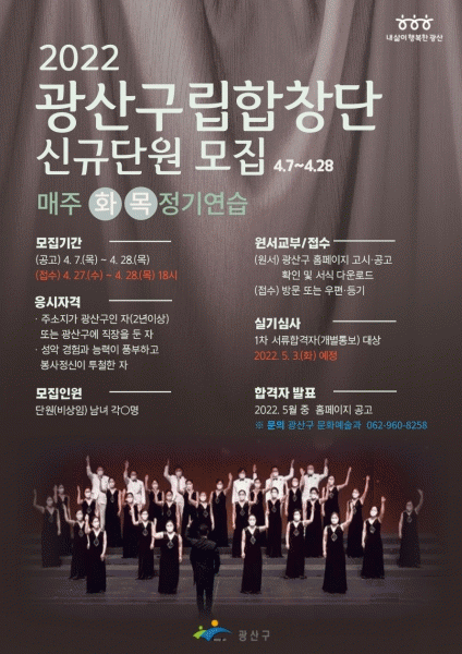 [¹Ìµð¾îÀü³² ±èÁ¤¿ì ±âÀÚ] ±¤ÁÖ ±¤»ê±¸°¡ ±¤»ê±¸¸³ÇÕâ´Ü ½Å±Ô ´Ü¿øÀ» ¸ðÁýÇÑ´Ù. 2000³â â´ÜÇÑ ±¤»ê±¸¸³ÇÕâ´ÜÀº 2011³â ³²³àÈ¥¼ºÇÕâ´ÜÀ¸·Î Àç â´Ü, ¸Å³â ±¹Á¦±³·ùÀ½¾Çȸ¿Í Á¤±â¿¬ÁÖȸ¸¦ ¿°í ÀÖ´Ù. Àç´É±âºÎ °ø¿¬, ´ë³»¡¤¿Ü ÃÊû°ø¡¦