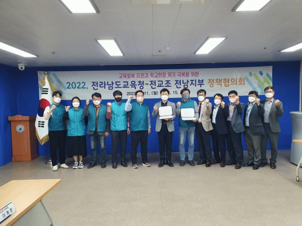 [¹Ìµð¾îÀü³² Á¦°¥´ëÁ¾ ±âÀÚ] Àü¶ó³²µµ±³À°Ã»°ú Àü±¹±³Á÷¿ø³ëµ¿Á¶ÇÕ Àü³²ÁöºÎ´Â 15ÀÏ Àü¶ó³²µµ±³À°Ã» ÁßȸÀǽǿ¡¼ ³ë»ç ¾çÃø °ü°èÀÚµéÀÌ Âü¼®ÇÑ °¡¿îµ¥ ¡®2022³â »ó¹Ý±â Á¤Ã¥ÇùÀÇȸ ü°á½Ä¡¯À» °¡Á³´Ù. Àü³²±³À°Ã»°ú Àü±³Á¶Àü³²ÁöºÎ´Â ÀÌ¡¦
