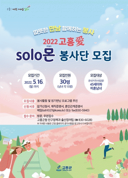 [¹Ìµð¾îÀü³² Á¦°¥´ëÁ¾ ±âÀÚ] °íÈﱺÀº ÀúÃâ»êÀ¸·Î ÀÎÇÑ Àα¸°¨¼Ò ±Øº¹À» À§ÇÑ Áö¿ª¸ÂÃãÇü ½ÃÃ¥À¸·Î ÃßÁøÁßÀÎ ¡®°íÈï»ç¶û ¼Ö·Î¸ó ºÀ»ç´Ü¡¯ Á¦3±â ȸ¿ø, ¹ÌÈ¥³²³à 30¸íÀ» ¸ðÁý ÁßÀ̶ó°í ¹àÇû´Ù. °íÈï»ç¶û ¼Ö·Î¸ó ºÀ»ç´ÜÀº ¼Ö·Î¸óÀÇ ÁöÇý¿Í¡¦