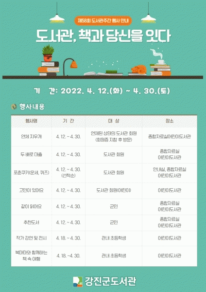 [¹Ìµð¾îÀü³² Á¦°¥´ëÁ¾ ±âÀÚ] Àü³²µµ¸³µµ¼°üÀº µµ¼°üÁÖ°£°ú Ã¥ÀÇ ³¯À» ¸Â¾Æ µ¶¼ÀÇ¿åÀ» ³ôÀ̰í Ã¥ Àд ¹®È¸¦ È®»êÇϱâ À§ÇØ 12ÀϺÎÅÍ 23ÀϱîÁö ¿Â¶óÀΠƯº°°¿¬, ±×¸²Ã¥ ¿øÈÀü½Ã µî ´Ùä·Î¿î ÇÁ·Î±×·¥À» ¿î¿µÇÑ´Ù. ¡®µµ¼°ü, Ã¥°ú ´ç¡¦