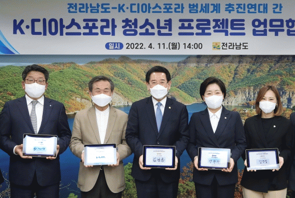 [¹Ìµð¾îÀü³² Á¦°¥´ëÁ¾ ±âÀÚ] Àü¶ó³²µµ´Â 11ÀÏ µµÃ»¿¡¼ ¡®K¡¤µð¾Æ½ºÆ÷¶ó ¹ü¼¼°è ÃßÁø¿¬´ë¡¯¿Í ¡®K¡¤µð¾Æ½ºÆ÷¶ó û¼Ò³â ÇÁ·ÎÁ§Æ®¡¯ ¾÷¹«Çù¾àÀ»Çß´Ù. ¾÷¹«Çù¾à¿¡´Â ¹ü¼¼°è ÃßÁø¿¬´ëÃø °íµµ¿ø ¾ÆÄ§ÆíÁö¹®ÈÀç´Ü ÀÌ»çÀå, ¾çÇâÀÚ ±¹È¸ÀÇ¿ø, ÃÖ¡¦