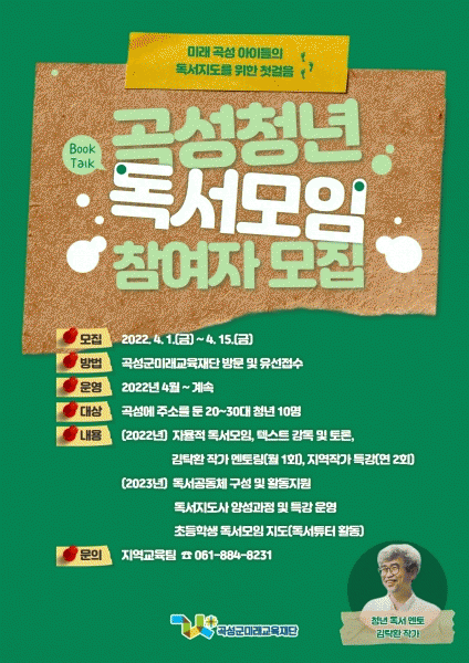 [¹Ìµð¾îÀü³² Á¦°¥´ëÁ¾ ±âÀÚ] °î¼º±º¹Ì·¡±³À°Àç´Ü¿¡¼´Â °ü³» 20~30´ë û³âµéÀ» ´ë»óÀ¸·Î °î¼º û³â µ¶¼¸ðÀÓ Âü¿©ÀÚ¸¦ ¿À´Â 15ÀϱîÁö ¸ðÁýÇÑ´Ù°í ¹àÇû´Ù. °î¼º û³âµéÀÌ Ã¥À» Àаí À̾߱âÇÒ ¼ö Àִ ȯ°æÀ» Á¶¼ºÇϰí À̵éÀ» ÇâÈÄ Áö¿ª ¡¦
