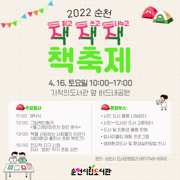 [¹Ìµð¾îÀü³² ÀÓ¼º¿Ï ±âÀÚ]¼øÃµ½Ã´Â ¿À´Â 12ÀϺÎÅÍ 18ÀϱîÁö Á¦58ȸ µµ¼°üÁÖ°£À» ¸Â¾Æ ¡®2022 ¼øÃµ Ã¥¡¤Ã¥¡¤Ã¥ Ã¥ÃàÁ¦¡¯¸¦ Æ÷ÇÔÇØ ´Ù¾çÇÑ µ¶¼¹®È Çà»ç¸¦ ¸¶·ÃÇß´Ù. ¼øÃµ½Ã¸³µµ¼°ü 8°³°ü¿¡¼ ´Ù¾çÇÑ Ä³¸¯ÅÍ ÀÇ»óÀ» ºô·Á ÀԾ ¼ö Àִ¡¦