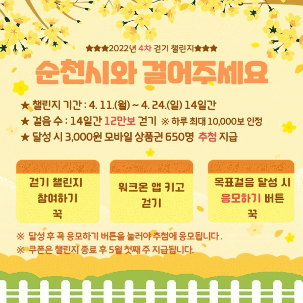 [¹Ìµð¾îÀü³² ÀÓ¼º¿Ï ±âÀÚ] ¼øÃµ½Ã°¡ µû¶æÇØÁø º½³¯À» ¸Â¾Æ »ýȰ ¼Ó °È±â¿îµ¿ È®»ê ¹× ½Ã¹ÎÀÇ °Ç°ÁõÁøÀ» À§ÇØ 4Â÷ °È±â 縰Áö¸¦ ½ÃÀÛÇÑ´Ù. À̹ø 縰Áö´Â ¿À´Â 11ÀϺÎÅÍ 24ÀϱîÁö 14Àϰ£ ¿î¿µµÇ¸ç 14Àϰ£ 12¸¸º¸ °È±â¸¦ ´Þ¼ºÇÑ ½Ã¹Î¿¡°Ô¡¦