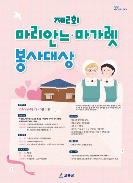[¹Ìµð¾îÀü³² Á¦°¥´ëÁ¾ ±âÀÚ] °íÈﱺÀº ¸¶¸®¾È´À¿Í ¸¶°¡·¿ µÎ ºÐ °£È£»çÀÇ ¼þ°íÇϰí Çå½ÅÀûÀÎ ºÀ»çÁ¤½ÅÀ» ÀÕ´Â Á¦2ȸ ¸¶¸®¾È´À¡¤¸¶°¡·¿ ºÀ»ç´ë»ó Èĺ¸ÀÚ¸¦ Ãßõ °ø¸ðÇÑ´Ù. ¿À´Â 5¿ù 31ÀϱîÁö Èĺ¸ÀÚ ÃßõÀ» ¹Þ´Â ºÀ»ç´ë»óÀº °£È£ºÎ¹®°ú ºÀ¡¦