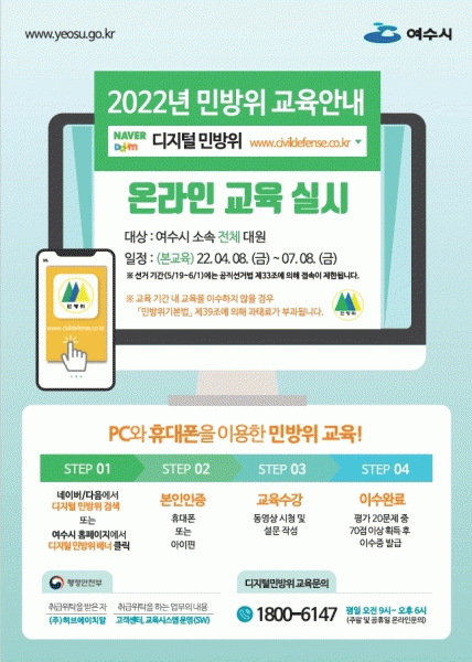 [¹Ìµð¾îÀü³² ÀüÇü¼º ±âÀÚ] ¿©¼ö½Ã°¡ ¿À´Â 4¿ù 8ÀϺÎÅÍ 7¿ù 8ÀϱîÁö ¡®2022³âµµ ¹Î¹æÀ§´ë¿ø »çÀ̹ö±³À°¡¯À» ½Ç½ÃÇÑ´Ù°í 6ÀÏ ¹àÇû´Ù. ±³À° ´ë»óÀÚ´Â ¿©¼ö½Ã¿¡ ÁÖ¼ÒÁö¸¦ µÐ ¸¸ 20¼¼ºÎÅÍ 40¼¼±îÁö ¸ðµç ¹Î¹æÀ§´ë¿øÀÌ´Ù. ±³À° ¹æ¹ýÀº ½Ã Ȩ¡¦