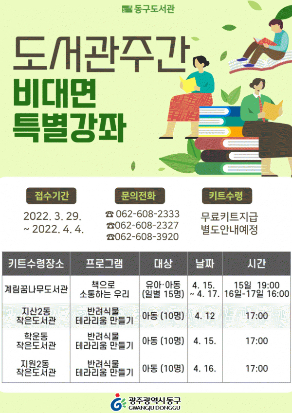 [¹Ìµð¾îÀü³² ±èÁ¤¿ì ±âÀÚ] ±¤ÁÖ µ¿±¸´Â 4¿ù µµ¼°ü ÁÖ°£À» ¸Â¾Æ °ü³» À¯¾Æ ¹× ¾Æµ¿À» ´ë»óÀ¸·Î Çϴ Ưº°°Á ¿î¿µÀ» À§ÇØ Âü¿©ÀÚ¸¦ ¼±Âø¼ø ¸ðÁýÇÑ´Ù°í ¹àÇû´Ù. À̹ø °Á´ åÀ¸·Î ¼ÒÅëÇÏ´Â ¿ì¸® ¹Ý·Á½Ä¹°°ú ÇÔ²² Å׶󸮿ò ¸¸µé±â ÇÁ·Î¡¦
