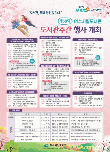 [¹Ìµð¾îÀü³² ÀüÇü¼º ±âÀÚ] ¿©¼ö½Ã°¡ ¿À´Â 4¿ù 12ÀϺÎÅÍ 18ÀϱîÁö ½Ã¸³µµ¼°ü 7°³°ü¿¡¼ ¡®Á¦58ȸ µµ¼°üÁÖ°£ Çà»ç¡¯¸¦ °³ÃÖÇÑ´Ù. ¡®µµ¼°ü, Ã¥°ú ´ç½ÅÀ» ÀÕ´Ù¡¯¶ó´Â ÁÖÁ¦·Î ÁøÇàµÇ´Â À̹ø Çà»ç´Â Äڷγª19·Î ÁöÄ£ ½Ã¹ÎµéÀ» À§ÇØ ¿Â¿ÀÇÁ¶ó¡¦