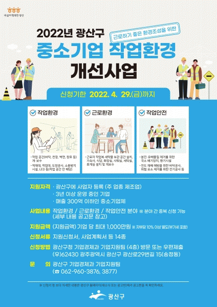[¹Ìµð¾îÀü³² ±èÁ¤¿ì ±âÀÚ] ±¤ÁÖ ±¤»ê±¸°¡ 4¿ù29ÀϱîÁö ¡®2022³â ±¤»ê±¸ Áß¼Ò±â¾÷ÀÛ¾÷ȯ°æ °³¼±»ç¾÷¡¯¿¡ Âü¿©ÇÒ ±â¾÷À» ¸ðÁýÇÑ´Ù. Áß¼Ò±â¾÷ ÀÛ¾÷ȯ°æ °³¼±»ç¾÷Àº ÀÛ¾÷ȯ°æ ±Ù·Îȯ°æ ÀÛ¾÷¾ÈÀü 3°³ ºÐ¾ß·Î ÁøÇàµÇ¸ç ºÐ¾ßº°·Î È¥ÇÕÇÑ »ç¾÷µµ¡¦