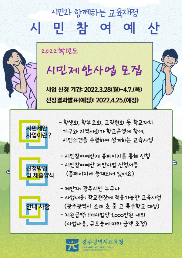 [¹Ìµð¾îÀü³² Á¦°¥´ëÁ¾ ±âÀÚ] ±¤Áֽñ³À°Ã»ÀÌ Äڷγª19 È®»êÀ¸·Î ÀÎÇØ 2022³â Á¦1ȸ ½Ã¹ÎÂü¿©¿¹»êÀ§¿øÈ¸¸¦ ºñ´ë¸éÀ¸·Î °³ÃÖÇØ 2022³â ½Ã¹ÎÁ¦¾È»ç¾÷ ¿î¿µ °èȹÀ» ¼¸é ½ÉÀÇÇß´Ù. 22ÀÏ ½Ã±³À°Ã»¿¡ µû¸£¸é ¡®½Ã¹ÎÁ¦¾È»ç¾÷¡¯Àº ½Ã¹Î°ú ÇÔ²²ÇÏ¡¦