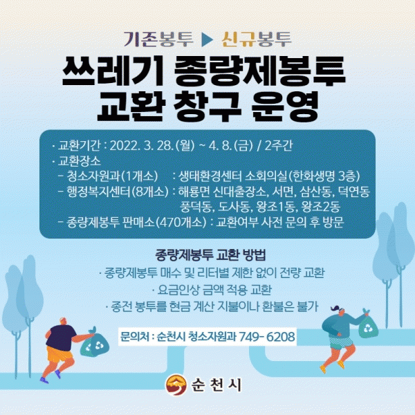[¹Ìµð¾îÀü³² ÀÓ¼º¿Ï ±âÀÚ] ¼øÃµ½Ã°¡ ¿ÃÇØ 1¿ù 1ÀÏÀÚ Á¾·®Á¦ºÀÅõ °¡°ÝÀλóÀ¸·Î º¯°æµÈ ±âÁ¸ Á¾·®Á¦ºÀÅõ¸¦ ½Å±Ô ºÀÅõ·Î ±³È¯ÇÏ´Â ±³È¯Ã¢±¸¸¦ ¿î¿µÇÑ´Ù. ±âÁ¸ Á¾·®Á¦ºÀÅõ´Â 3¿ù¸»±îÁö »ç¿ëÇÏ°í ±âÇÑ ³» »ç¿ëÇÏÁö ¸øÇÑ Á¾·®Á¦ºÀÅõ´Â 3¿ù 28ÀÏ¡¦