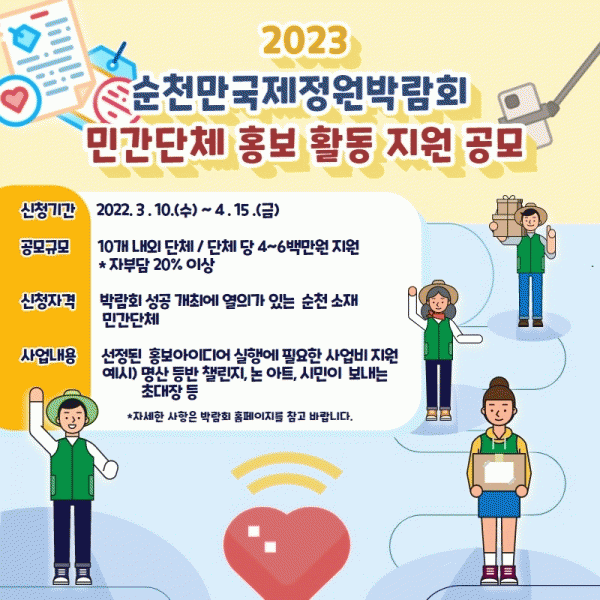 [¹Ìµð¾îÀü³² ÀÓ¼º¿Ï ±âÀÚ] ¼øÃµ¸¸±¹Á¦Á¤¿ø¹Ú¶÷ȸ Á¶Á÷À§¿øÈ¸´Â ½Ã¹Î°ú ÇÔ²²ÇÏ´Â 2023¼øÃµ¸¸±¹Á¦Á¤¿ø¹Ú¶÷ȸ È«º¸¸¦ À§ÇØ ¡®¹Î°£´Üü È«º¸È°µ¿ Áö¿ø »ç¾÷¡¯ Âü¿©´Üü¸¦ °ø¸ðÇÑ´Ù. À̹ø »ç¾÷Àº ½Ã¹ÎµéÀÇ Âü½ÅÇÑ ¾ÆÀ̵ð¾î¸¦ Ȱ¿ëÇØ Áö¿ª¿¡¼¡¦