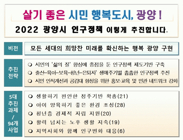 [¹Ìµð¾îÀü³² ÀÓ¼º¿Ï ±âÀÚ] ±¤¾ç½Ã´Â ¹Î¡¤°üÀü¹®°¡·Î ±¸¼ºµÈ ¡®±¤¾ç½Ã Àα¸È°·ÂÁõÁø ÃßÁøÀ§¿øÈ¸¡¯¿¡¼ ½ÉÀÇ ÀǰáµÈ ¡®2022³â Àα¸Á¤Ã¥ ½ÃÇà°èȹ¡¯À» È®Á¤ÇØ 3¿ùºÎÅÍ º»°Ý ½ÃÇàÇÑ´Ù. ½Ã´Â Àü±¹ÀûÀÎ ÃÊÀúÃâ»ê°ú °í·ÉÈ·Î ÀÎÇØ °¡¼ÓÈµÇ°í ¡¦