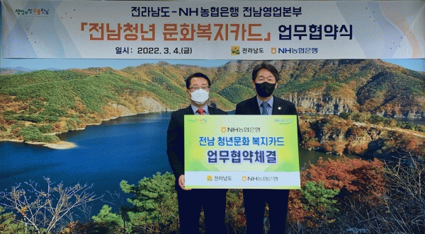 [¹Ìµð¾îÀü³² Á¦°¥´ëÁ¾ ±âÀÚ] Àü¶ó³²µµ°¡ û³â¿¡°Ô ¿©°¡È°µ¿ºñ¿Í ¹®Èºñ¸¦ Áö¿øÇÏ´Â ¡®Ã»³â ¹®Èº¹ÁöÄ«µå¡¯ Áö¿ø»ç¾÷ÀÇ È¿À²Àû ÃßÁøÀ» À§ÇØ 4ÀÏ µµÃ»¿¡¼ NH³óÇùÀºÇà°ú ¾÷¹«Çù¾àÀ» Çß´Ù. ±¤ÁÖÀºÇà¿¡ ÀÌ¾î ³óÇùÀºÇà±îÁö Çù¾àÀ» È®´ëÇØ ±¤ÁÖ¡¦