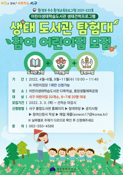 [¹Ìµð¾îÀü³² ±èÁ¤¿ì ±âÀÚ] ±¤ÁÖ ¼±¸ ¾î¸°ÀÌ»ýÅÂÇнÀµµ¼°üÀÌ¡®»ýÅ µµ¼°ü ŽÇè´ë¡¯¿¡ Âü¿©ÇÒ ¼±¸ °ü³» ¾î¸°ÀÌÁý 20°³¼Ò¸¦ ¸ðÁýÇÑ´Ù. ȯ°æºÎ ¿ì¼ö ȯ°æ±³À°ÇÁ·Î±×·¥À¸·Î ¼±Á¤µÈ¡®»ýÅ µµ¼°ü ŽÇè´ë¡¯´Â ¾î¸°ÀÌ»ýÅÂÇнÀµµ¼°ü°ú dz¾Ï¡¦