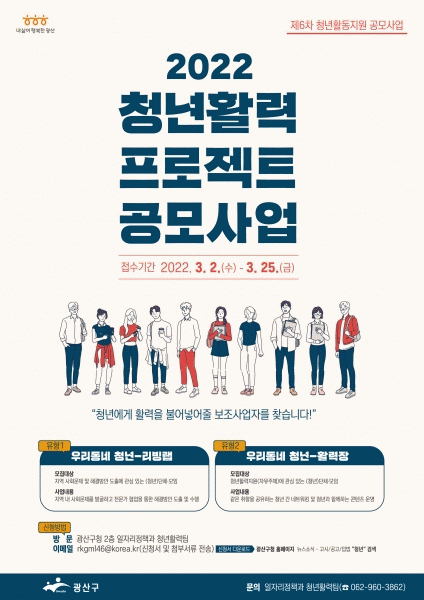 [¹Ìµð¾îÀü³² ±èÁ¤¿ì ±âÀÚ] ±¤ÁÖ ±¤»ê±¸´Â û³âÀÌ È°·Â ³ÑÄ¡°í ÇູÇÑ »îÀÇ ÁÖü·Î °Åµì³¯ ¼ö ÀÖµµ·Ï Áö¿øÇÏ´Â ¡®2022 û³â Ȱ·ÂÇÁ·ÎÁ§Æ® °ø¸ð»ç¾÷¡¯ ¿¡ Âü¿©ÇÒ Ã»³â º¸Á¶»ç¾÷ÀÚ¸¦ 25ÀϱîÁö ¸ðÁýÇÑ´Ù°í ¹àÇû´Ù. ¡®Ã»³â Ȱ·ÂÇÁ·ÎÁ§Æ®¡¯´Â ¡¦