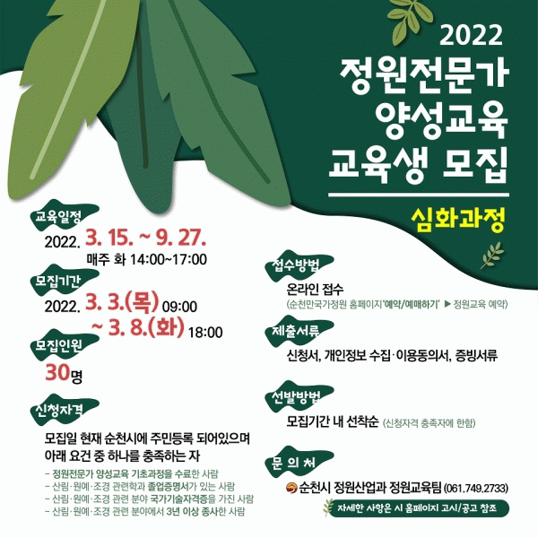 [¹Ìµð¾îÀü³² ÀÓ¼º¿Ï ±âÀÚ] ¼øÃµ½Ã´Â ½Ã¹Îµé¿¡°Ô ¾çÁúÀÇ Á¤¿ø ±³À° ¡¤ ½Ç½À ±âȸ Á¦°ø°ú »ýȰ ¼Ó Á¤¿ø¹®È È®»êÀ» À§ÇØ Á¤¿øÀü¹®°¡ ¾ç¼º±³À° ½ÉȰúÁ¤ ±³À°»ý 30¸íÀ» 3¿ù 3ÀϺÎÅÍ 3¿ù 8ÀϱîÁö 6Àϰ£ ¸ðÁýÇÑ´Ù. À̹ø ½ÉȰúÁ¤ ±³À°Àº Á¤¿ø¡¦