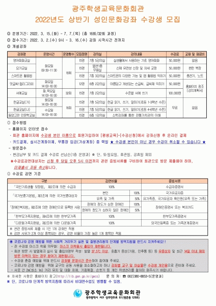 [¹Ìµð¾îÀü³² Á¦°¥´ëÁ¾ ±âÀÚ] ±¤ÁÖÇлý±³À°¹®Èȸ°üÀÌ ¡®2022³âµµ »ó¹Ý±â ¼ºÀι®È°Á¡¯ ¼ö°»ýÀ» ¸ðÁýÇÑ´Ù. 21ÀÏ Çлý±³À°¹®ÈȰü¿¡ µû¸£¸é À̹ø °Á´ ¿À´Â 3¿ù15ÀÏ~7¿ù7ÀÏ ¿î¿µµÈ´Ù. ¼ö°½ÅûÀº 3¿ù2ÀϺÎÅÍ °Á ½ÃÀÛ Àü±îÁö ¼±Âø¡¦