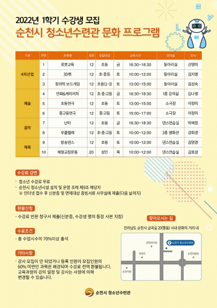 [¹Ìµð¾îÀü³² ÀÓ¼º¿Ï ±âÀÚ] ¼øÃµ½Ã´Â ¿À´Â 3¿ù 17ÀϺÎÅÍ 7¿ù 2ÀϱîÁö 4°³¿ù°£ û¼Ò³â¼ö·Ã°ü¿¡¼ ¡®2022³â 1Çб⠹®ÈÇÁ·Î±×·¥¡¯À» ¿î¿µÇÑ´Ù. ÇÁ·Î±×·¥Àº 4°³ ºÐ¾ß, 10°³ °ú¸ñÀ¸·Î ±¸¼ºµÇ¾î ÁÖ1ȸ 2½Ã°£¾¿ ¿î¿µµÉ ¿¹Á¤ÀÌ´Ù. Âü¿©´ë»óÀº ¼ø¡¦