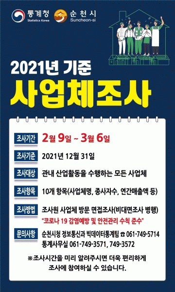 [¹Ìµð¾îÀü³² ÀÓ¼º¿Ï ±âÀÚ] ¼øÃµ½Ã´Â ¿À´Â 2¿ù 9ÀϺÎÅÍ 3¿ù 6ÀϱîÁö ¡®2021³â ±âÁØ »ç¾÷üÁ¶»ç¡¯¸¦ ½Ç½ÃÇÑ´Ù. Åë°èûÀÌ ÁÖ°üÇØ ¸Å³â ½Ç½ÃÇÏ´Â »ç¾÷üÁ¶»ç´Â ¼øÃµ½Ã ¸ðµç »ç¾÷üÀÇ Áö¿ªº° ºÐÆ÷ ¹× °í¿ë ±¸Á¶¸¦ ÆÄ¾ÇÇØ, ±¹°¡¿Í ¼øÃµ½ÃÀÇ °¢¡¦