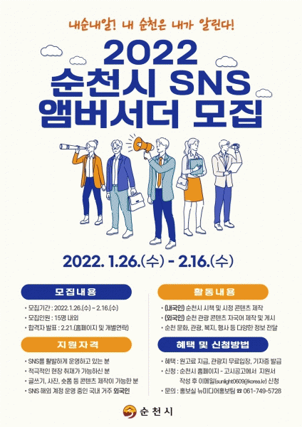[¹Ìµð¾îÀü³² ÀÓ¼º¿Ï ±âÀÚ] ¼øÃµ½Ã°¡ ¿À´Â 16ÀϱîÁö ³»¡¤¿Ü±¹ÀΠû³âÀ» ´ë»óÀ¸·Î ¡®2022 ¼øÃµ½Ã SNS ¾Ú¹ö¼´õ¡¯¸¦ ¸ðÁýÇÑ´Ù. SNS ¾Ú¹ö¼´õ´Â ¼øÃµÀÇ ½ÃÁ¤, ¹®È, °ü±¤, º¹Áö µî ´Ù¾çÇÑ È«º¸ ÄÜÅÙÃ÷¸¦ ¹ß±¼Çϰí ÇöÀåÃëÀç ¹× ±â»ç Á¦ÀÛÀ» Å롦