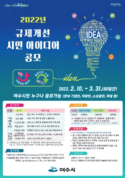 [¹Ìµð¾îÀü³² ÀüÇü¼º ±âÀÚ] ¿©¼ö½Ã°¡ ½Ã¹Î»ýȰ°ú ±â¾÷ Ȱµ¿À» ÀúÇØÇÏ´Â ºÒÇÕ¸®ÇÑ »ýȰ ¼Ó ±ÔÁ¦¸¦ °³¼±Çϱâ À§ÇØ ¡®2022³â ±ÔÁ¦°³¼± ½Ã¹Î ¾ÆÀ̵ð¾î¡¯¸¦ °ø¸ðÇÑ´Ù°í 7ÀÏ ¹àÇû´Ù. °ø¸ð±â°£Àº ¿À´Â 10ÀϺÎÅÍ ´ÙÀ½ ´Þ 31ÀϱîÁö¸ç ¡®½Ã¹Î»ýȰ ¹×¡¦