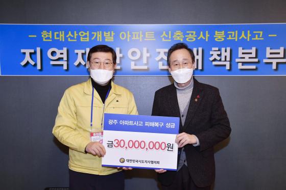 [¹Ìµð¾îÀü³² Á¦°¥´ëÁ¾ ±âÀÚ] À̿뼷 ±¤ÁÖ±¤¿ª½ÃÀåÀÌ 25ÀÏ ¿ÀÈÄ Çö´ë»ê¾÷°³¹ß ¾ÆÆÄÆ® ½ÅÃà°ø»ç ºØ±«»ç°í ÇöÀå¿¡ ¸¶·ÃµÈ Áö¿ªÀç³¾ÈÀü´ëÃ¥º»ºÎ¿¡¼ ¼ÛÇÏÁø ÀüºÏµµÁö»ç(Àü±¹½ÃµµÁö»çÇùÀÇȸÀå)·ÎºÎÅÍ »ç°í ¼ö½À Áö¿ø±ÝÀ» Àü´Þ ¹Þ°í ÀÖ´Ù.