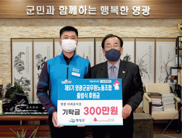 [¹Ìµð¾îÀü³² Á¦°¥´ëÁ¾ ±âÀÚ] ¿µ±¤±ºÀº Áö³ 21ÀÏ Á¦9±â ¿µ±¤±º°ø¹«¿ø³ëµ¿Á¶ÇÕ Á¶¹ü±â À§¿øÀåÀÌ Èñ¸Á2022 ³ª´®Ä·ÆäÀο¡ Âü¿©ÇØ ÀÌ¿ôµ½±â ¼º±Ý 300¸¸¿øÀ» Àü´ÞÇß´Ù°í ¹àÇû´Ù. ¿µ±¤±º°ø¹«¿ø³ëµ¿Á¶ÇÕÀº 2022³â Á¦9±â ÀÓ¿øÁøÀ» »õ·Î ¼±ÃâÇÏ°í¡¦