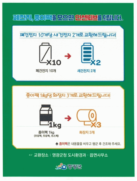 [¹Ìµð¾îÀü³² Á¦°¥´ëÁ¾ ±âÀÚ] ¿µ±¤±ºÀº ÀçȰ¿ëǰ ºÐ¸®¼ö°ÅÀÇ ±º¹Î Âü¿©¸¦ Àû±Ø À¯µµÇϱâ À§ÇØ ÆóÀüÁö, Á¾ÀÌÆÑ ¼ö°Å¿¡ Àû±Ø Âü¿©ÇÑ Áֹο¡°Ô Àμ¾Æ¼ºê¸¦ Áö¿øÇÑ´Ù°í ¹àÇû´Ù. À̹ø »ç¾÷Àº Æó°ÇÀüÁö 10°³¸¦ ¸ðÀ¸¸é »õ ÀüÁö 2°³·Î ±³È¯ÇØÁÖ°í¡¦